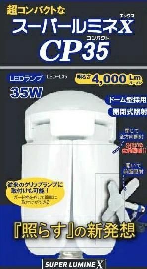 35W省エネ&長寿命LED電球、開いて前面照射、閉じて前方照射します CP35用替球 明るさ(lm):4000 消費電力(W):35 光源色:昼光色(6000K) 電圧(V):100〜120 羽根を広げた時の直径(mm):300 材質:ポリカーボネート